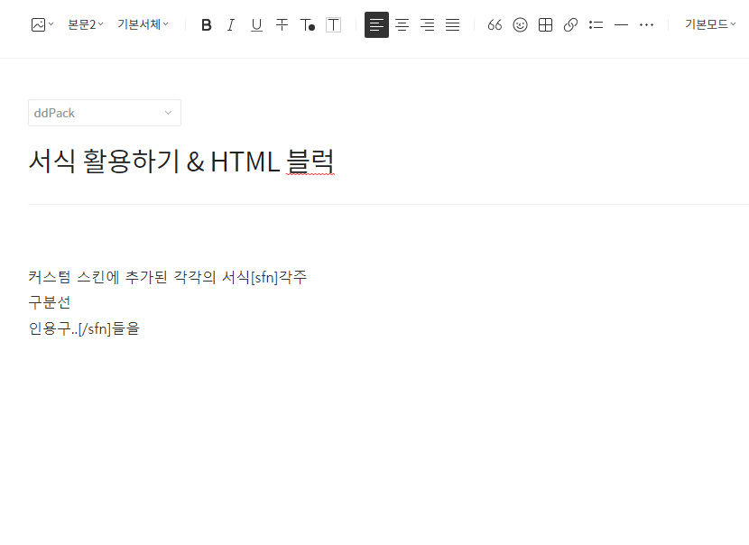 1. 글 작성시 기본모드에서 각주를 넣고 싶은 곳에 아래처럼 타이핑 하시면 됩니다.